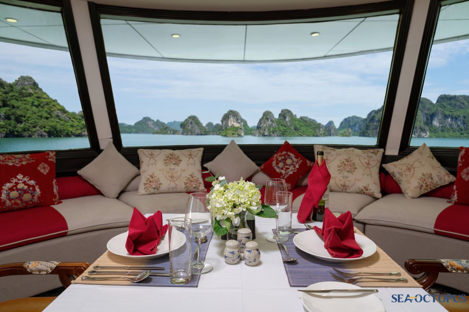 Quý khách sẽ được ngắm nhìn khung cảnh hùng vĩ của vùng đất rồng thiêng - Vịnh Hạ Long trong khi du thuyền Sea Octopus lướt trên những con sóng lấp lánh.