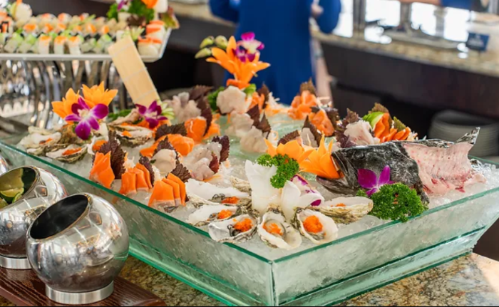12h30- 13h45 Thưởng Thức Bữa Trưa Sau hành trình thăm quan hang Sửng Sốt khoảng 1h đồng hồ, quý khách sẽ được phục vụ bữa trưa tự chọn( buffet) trên du thuyền.